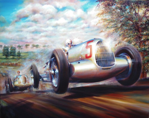 The Auto Union of Bernd Rosemeyer leaping to victory at Donington in 1937.
