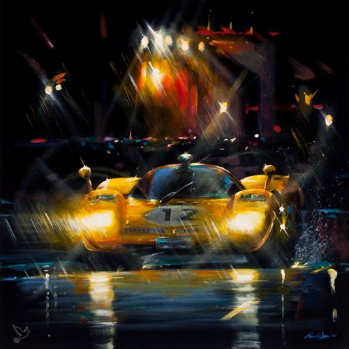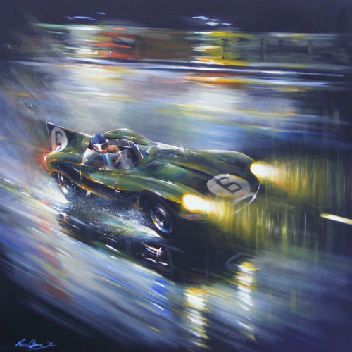 Mike Hawthorn in the Jaguar D-type racing through the night.