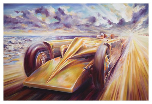 Sir Henry Seagrave in the Golden Arrow, setting a new landspeed record of 231.4mph. at Daytona Beach in 1929.